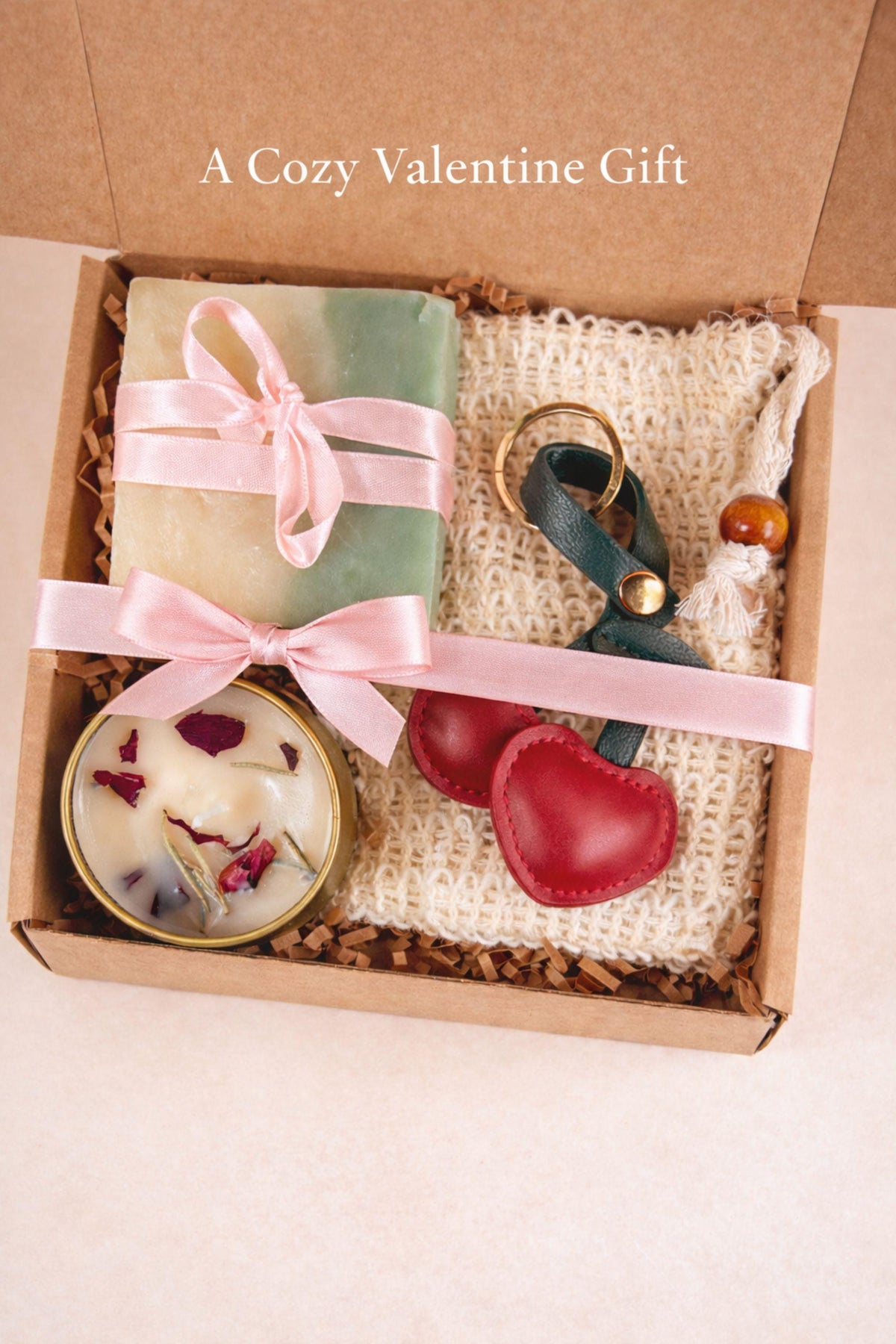Valentine’s Day thinking of you gift box with handmade soap, botanical candle, crochet washcloth, and leather cherry keychain arranged in a kraft gift box. Cozy Valentine care package featuring artisan soap tied with ribbon, floral candle in tin, soft eco washcloth, and charming heart-inspired cherry accessory. Meaningful Valentine gift for her, long distance Valentine care package, or romantic handmade Valentine present ready to gift.